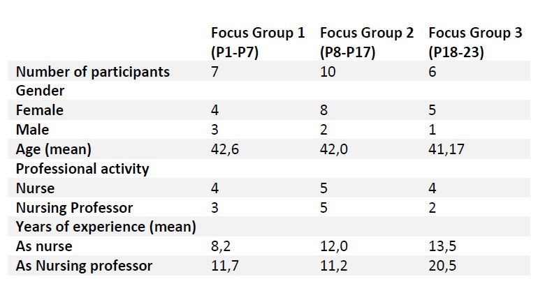 A total of 23 experts participated in the three focus groups, after being selected by intentional non-probabilistic sampling. The participants are investigators of the Research Group NursID: Innovation & Development in Nursing, of the Center for Health Technology and Services Research (CINTESIS). We asked the researchers to participate by sending them an email with the invitation.