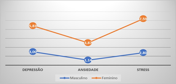 Vale (2021) apresentou valores elevados no seu estudo: depressão - M = 5,67 ± 5,61; ansiedade - M = 4,75 ± 5,28 e stress - M = 7,60 ± 5,87, referindo a autora que o sexo feminino foi o que apresentou piores scores.