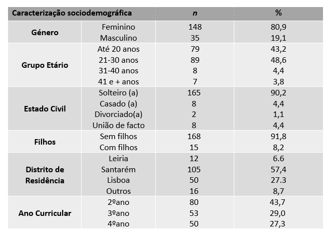 Sobre as características sociodemográficas - Tabela 1 - 148 dos estudantes (80,9 %) eram do género feminino e 35 (19,1%) do género masculino. A idade variou entre os 18 e os 55 anos, sendo a média de 22,8 anos. 165 (90,2%) dos estudantes eram solteiros ou divorciados e 168 (91,8%) não tinham filhos. Sobre o distrito de residência fora do período de aulas, 105 (57,4%) dos estudantes residiam no distrito de Santarém, seguindo-se o distrito de Lisboa com 50 (27,3%). Dos 183 estudantes, 80 (43,7%) frequentavam o 2º ano, 53 (29,0%) o 3º ano e 50 (27,3%) o 4º ano.
