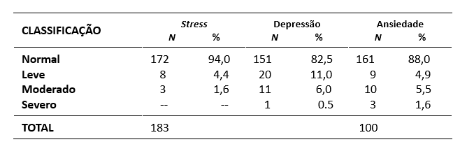 Cerca de 3 (1,6%) dos estudantes, referiram um nível moderado de stress; 11 (6%) e 1 (0,5%) um nível moderado e severo de depressão, respetivamente, e 10 (5,5%) e 3 (1,6%) um nível moderado e severo, respetivamente, de ansiedade.