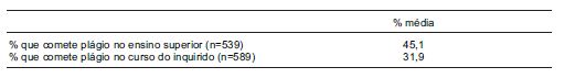 Tabela 1 Perceção da incidência de plágio no ensino superior e no curso do inquirido (indicadores sumários)