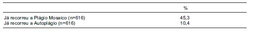 Ao recorrer a indicadores descritivos para plágio mosaico e autoplágio, mas sem localizar a explicação destas formas de plagiar num cenário académico quotidiano, verifica-se que 45,3% dos inquiridos afirmam já ter cometido plágio mosaico e 10,4% autoplágio (Tabela 2)1