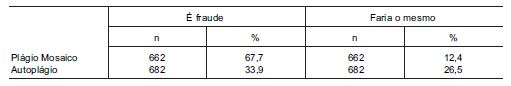 Cerca de 68% dos inquiridos consideram fraude o caso de plágio mosaico apresentado e unicamente 12,4% admitem vir a fazer o mesmo. Já o autoplágio é considerado fraude por uma parcela de apenas 33,9% e, provavelmente também por isso mesmo, se eleve a percentagem dos que admitem vir a cometê-lo (26,5%).