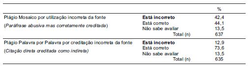 De implementação mais facilitada, mas também escassas vezes encetada (Colella-Sandercock, 2016), surge a sugestão de John Walker (2010): medir o que os estudantes fazem e não apenas o que dizem fazer. Dando sequência à sugestão de Walker para a mensuração da incidência do plágio, procurou-se no questionário aplicado averiguar se os estudantes inquiridos conseguem utilizar e creditar corretamente fontes externas nos seus trabalhos e, portanto, evitar cometer plágio mesmo quando não o pretendem cometer. Utilizam-se, para isso, dois indicadores avaliativos para plágio, quer na sua versão palavra por palavra, quer na de mosaico. No primeiro caso, apresenta-se uma paráfrase abusiva de um excerto, ou seja, substituem-se por sinónimos todas as palavras do texto original, ainda que se tenha creditado corretamente a sua fonte. No segundo, cita-se diretamente um excerto de um texto a par com a referência aos seus autores e a data da obra, mas sem colocar esse excerto entre aspas nem tampouco indicar o número da página na obra citada. Quanto aos resultados, a citação indireta abusiva ou, se se preferir, paráfrase abusiva, foi identificada como uma situação de plágio (mosaico) por 42,4% dos respondentes, enquanto apenas 12,9% dos inquiridos conseguiram identificar o caso de plágio (palavra por palavra) que resultava da creditação de uma citação direta como indireta (Tabela 4).