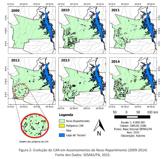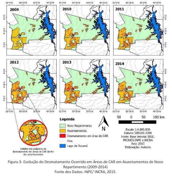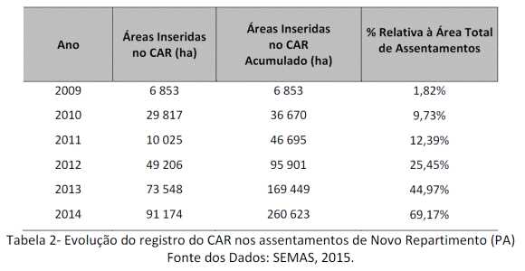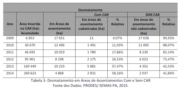 No ano de 2014, do total de área desmatada em áreas de assentamentos, 58,16% foram em áreas com CAR, e 41,84% em áreas não registradas. Embora a princípio, esperava-se que as áreas com CAR tivessem menores incidências de desmatamento, dados apontaram uma ocorrência maior em áreas com CAR. Como possível justificativa, tem-se que as áreas que tiveram maior adesão ao CAR, foram aquelas que mais precisavam regularizar suas atividades rurais, as quais muitas vezes prescindiam de modificações no uso da terra, para adequação às atividades de agricultura ou pecuária.