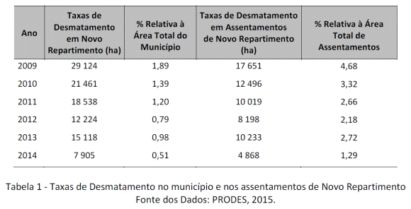 Apesar desse decréscimo, tanto a nível municipal quanto em seus assentamentos, tem-se que os resultados das análises de mudança do uso da terra em assentamentos no período de 2009 a 2014 mostram que 63 465 hectares (16,8% da área total de assentamentos) de cobertura florestal foram desmatados. Esse quantitativo corresponde a 60,8% da área total desmatada no município no mesmo período. Essa realidade pode ser referendada pela pesquisa de Barroso e Alencar (2014), a qual afirma que o significativo número de assentamentos criados com a finalidade de resolver os problemas sociais no campo tem ocasionado consideráveis danos ao meio ambiente, uma vez que os assentados necessitam de área útil à implantação de suas atividades agropecuárias. Foi neste cenário que os assentamentos rurais representaram importante foco de desmatamento.
