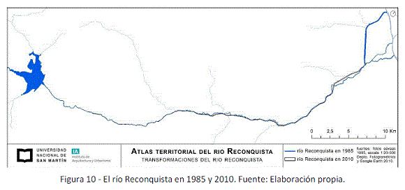 El dibujo del Reconquista en 2010 (Figura 10)[13] muestra que, respecto de su configuración en 1985, el río fue canalizado, ensanchado y rectificado desde la represa Roggero hasta el Canal Aliviador. Las transformaciones responden a la ejecución del Programa de Saneamiento y Control de las Inundaciones de la cuenca del río Reconquista, desde el año 1996. Se destaca una nueva canalización, previo a la desviación del Canal Aliviador, que corresponde a la obra del “Canal DPH”, iniciada previamente por el Gobierno Provincial y finalizada a principios de los 2000 en el marco del Programa.