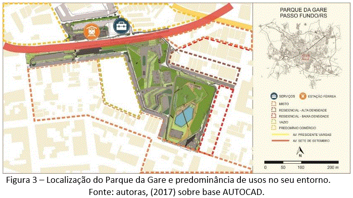 Com área de 72 mil m² (PMPF, 2016)[4], o Parque da Gare está inserido na malha urbana de Passo Fundo e é circundado por grande diversidade de usos e ocupações do solo. A Figura 3 apresenta a relação entre estes usos e sua proximidade com o Parque, com destaque para a antiga Estação Ferroviária e serviços institucionais.