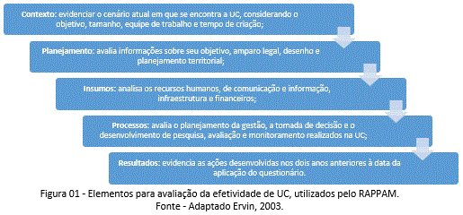 Observa-se que estes e outros estudos relacionados com a avaliação da efetividade de UCs, reforçaram que seria altamente vantajoso sintetizar informações específicas do local, para obter maior compreensão dos fatores de sucesso nas abordagens de conservação e integrar estudos em nível local. Entretanto, segundo o WWF (2017), definir até que ponto as UCs ou o sistema destas são efetivos, tem sido uma árdua tarefa expressada pela aplicação de diversas ferramentas.