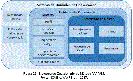 A avaliação da gestão desenvolvida pelo RAPPAM, trabalha com base em uma abordagem sistêmica do processo, por entender que não se pode abstrair a influência da realidade que envolve as unidades de conservação. Dessa forma, o processo se inicia pela análise do contexto em que as áreas protegidas se inserem e, por isso, considera informações sobre a importância biológica e socioeconômica, as pressões e ameaças que as afetam e o nível de vulnerabilidade existente (WWF e SEMARH-GO, 2014) (Figura 2).