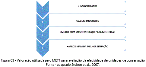 Nota-se que apesar da simplificação da coleta das informações, identifica-se distorções em relação ao cálculo da significância do dado. De acordo com Stolton et al. (2007) a hierarquização e pontuação das informações fornecem uma melhor avaliação da eficácia, se calculada como uma porcentagem para cada um dos seis elementos indicados pelo International Union for the Conservation of Nature (IUCN)/World Commission on Protected Areas (WCPA) (contexto, planejamento, insumos, processo, resultados e avaliações), correlacionando diferentes dimensões de análise.