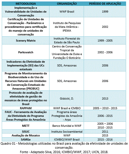 Over the last two decades, technical methodologies and procedures have emerged to assess the effectiveness of protected areas in order to identify the real capacity of these areas to plan and implement public policies related to socioeconomic and environmental issues. In this context, the present study arose with the purpose of analyzing the methodologies (Padovan, 2003), Ervin (2003), Stolton et al. (2007), Marinelli (2011) and ICMBIO / WWF (2017) applied and adapted to the Brazilian reality, considering methodological structure, application, advantages and limitations. Thus, it is intended to advance in the proposed methodological discussions and to analyze their level of contribution to the planning and management of these protected areas.