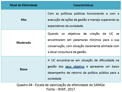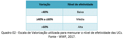 De forma geral, segue abaixo a escala de valorização utilizada para mensurar o nível de efetividade das UCs (Quadro 2).