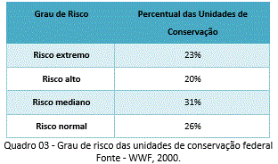 Os autores desenvolveram uma análise conjunta dos dados relativos à implementação e vulnerabilidade, o que permitiu a elaboração de uma “matriz de risco”, que agrupou as 86 unidades em quatro blocos, segundo o grau de ameaça enfrentado (quanto maior for a vulnerabilidade e menor for a implementação, maior o risco que a UC está correndo). Essa matriz de risco elaborada, demonstrou a situação das UCs brasileiras (Quadro 3).
