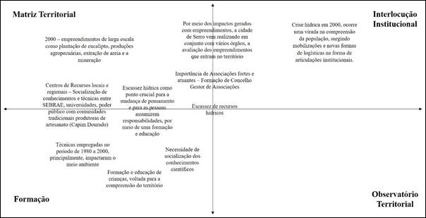O diagnóstico realizado na microrregião de Presidente Kubistchek, sobre as perspectivas dos atores locais, mostraram que a formação da região, derivada da diversidade cultural existente na época, levaram as comunidades aos percursos escolhidos e a crise hídrica nos territórios (Santos & Marques, 2002; Portugal & Marques, 2007; Scheunemann & Oosterbeek, 2012; Dallabrida, 2016; Oosterbeek, Werlen & Caron, 2017). Por meio do diagnóstico e dos resultados (figuras 4 e 6), os atores tiveram chance de refletir, por meio desta contextualização da formação da comunidade, sobre os conflitos que foram surgindo nos territórios devido à complexidade com que as comunidades foram tomando ao longo do tempo e como estas relações formaram as dinâmicas locais (Dallabrida, 2016; Shiki & Shiki, 2004). Neste sentido, estas relações dos atores ao longo do tempo em seus espaços de referências, levaram às práticas que ocorreram no território, aos sinônimos de pertencimento que foram sendo configurados/reconfigurados, as relações de poder que foram sendo construídas por meio das trocas, das informações e da comunicação, onde os detentores destes meios definiram os percursos sobre os demais grupos, o território e seus recursos naturais, evidenciando a forma como se estruturam as redes e nós no espaço geográfico (Raffestin & Santana, 2013).