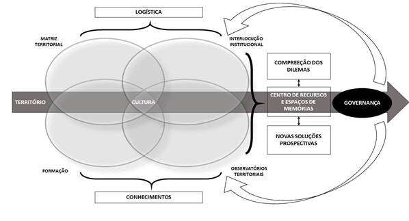 Mas como proporcionar esses espaços de reflexão e unir perspectivas diferentes e muitas vezes conflitantes em torno de projetos futuros? É por meio desta questão complexa que a literatura de GCIT traz o debate em torno dos Centros de Recursos, que seriam espaços de formação dos diversos atores de um território, oferecendo desde especializações acadêmicas a formações transversais do conhecimento para os mais variados grupos. Ao mesmo tempo em que os Espaços de Memórias subsidiariam a formação nestes centros de recursos, oferecendo um acervo histórico dos espaços geográficos e proporcionando a construção do saber, por meio de interações entre atores e ambientes para reflexão e sociabilidade (Oosterbeek, 2012; Oosterbeek, 2013). Estes dois locais, Centros de Recursos e os Espaços de Memórias, passam a ser entendidos como lugares de reflexão transdisciplinares e prospectivos (construção de ações), tendo como diretriz central a formação do capital humano em uma perspectiva cultural identitária (Santos, 2008; Scheunemann & Oosterbeek, 2012). Neste cenário, o Patrimônio Cultural tem papel fundamental para suavizar as barreiras de visões de mundo, dos vários grupos existentes nos territórios, pois o patrimônio de um território representa as apropriações simbólicas no espaço e no tempo de uma sociedade e lhes confere convergências e bases sobre interesses comuns (Oosterbeek & Scheunemann, 2012). Nesta perspectiva, a reflexão sobre os territórios parte de uma visão cultural identitária, objetivando valorizar o Patrimônio Cultural por meio da compreensão do espaço (territórios), tempo (dinâmicas) e causalidade (ocorrência das dinâmicas nos territórios), partindo de um debate entre gerações. Este debate passa a ter relevância pelo fato da troca de saberes territoriais contribuir para problematização das questões em profundidade e complexidade, e para a construção de novas possibilidades logísticas de médio e longo prazo (Scheunemann & Oosterbeek, 2012).