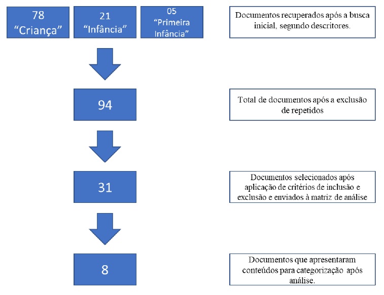 Com vistas aos procedimentos previamente descritos, as buscas produziram 104 documentos, sendo 78 para o descritor “Criança”, 21 para “Infância” e 05 para “Primeira Infância”, os quais foram transferidos para a matriz de síntese primária. Em seguida, procedeu-se a exclusão dos documentos repetidos, totalizando 94 que permaneceram para o processo de seleção por aplicação dos critérios de inclusão. Os documentos foram lidos na íntegra, classificados e 31 foram transferidos à matriz de análise, por serem pertinentes aos critérios propostos. Como etapa final, foram relacionados os conteúdos aos quatro indicadores de integralidade da atenção e os resultados organizados segundo núcleos para cada indicador. Cabe destacar que, dos 31 documentos, apenas 08 apresentaram conteúdos que permitiram sua categorização na análise (Figura 1).