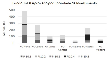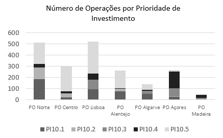 A maioria das operações destinadas à Educação foi financiada pelo Fundo Social Europeu (FSE), sendo apoiadas pelo Fundo Europeu de Desenvolvimento Regional (FEDER) aquelas enquadradas pela prioridade de investimento 10.5 (Infraestruturas de educação e formação). Por outro lado, é no POCH (e não nos POR) que se enquadra um maior volume de operações cofinanciadas no domínio da Educação e das qualificações: 74,42% do número de operações e 72,65% do montante de fundo total aprovado, quando comparando a base de dados do POCH com as bases de dados dos POR, atualizadas à data de 30 de junho de 2021. As análises seguintes focam apenas os POR, assim permitindo identificar as medidas educativas executadas com vista à promoção da competitividade de cada região, matéria central no espaço europeu. Posteriormente, a análise dos PIICIE, pela sua ausência nas Regiões Autónomas e na região do Algarve, circunscreve-se aos restantes quatro PO (Norte, Centro, Lisboa e Alentejo).