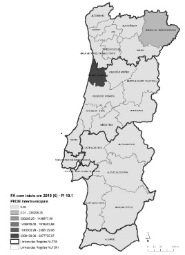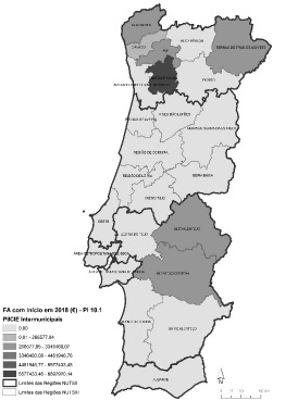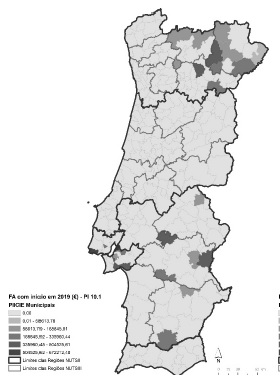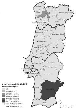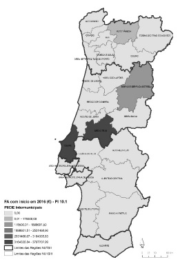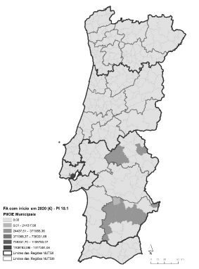 Uma análise cronológica por ano de início das operações (que pode ser distinto do ano de aprovação do cofinanciamento) permite perceber que 2017 e 2018 (Fig. 5 e Fig. 6) foram anos onde a atribuição de fundos para operações PIICIE foi substancialmente superior (Quadro 6). Por outro lado, permite constatar que o Norte não foi a região que apostou de imediato nestas medidas e projetos, tendo sido a região Centro a primeira a absorver mais fundos (Fig. 4). Em 2019, as regiões Norte e Centro consolidam a sua aposta nos PIICIE (Fig. 7), ainda que as operações com início neste período mobilizem um menor envelope financeiro, quando comparado com os primeiros anos do programa. Assim, em 2020, é o Alentejo que recebe mais fundos (Fig. 8).