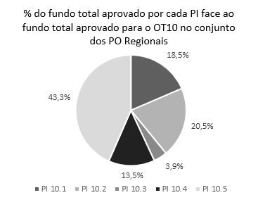 Por via das distintas taxas de cofinanciamento, um maior número de operações aprovadas não se reflete, necessariamente, num mais elevado montante de fundo total aprovado. Não obstante, na PI 10.1, aquela onde se integram os PIICIE, verifica-se um destaque da região Norte, ao nível do fundo total aprovado, mas também do próprio número de operações (Fig. 1 e Fig. 2). Como a Figura 2 ilustra, o fundo total aprovado para a PI 10.1, em cada um dos POR assume diferentes pesos, com uma clara assimetria entre o Continente e as Regiões Autónomas.