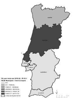 Em 2016, foram poucos os PIICIE intermunicipais a iniciar (Fig. 10), ao contrário de 2017, o ano de início de um maior número de operações PIICIE intermunicipais cofinanciadas (Quadro 7). Destaca-se a Região Centro, nesse mesmo ano (Fig. 11), pelo já aludido motivo de apenas compreender operações intermunicipais. As operações intermunicipais arrancam com mais força no Norte no ano de 2018 (Fig. 12), assistindo 2019 e 2020 a um abrandamento no início de PIICE intermunicipais (Fig. 13 e Fig. 14).