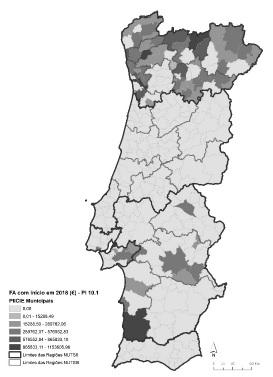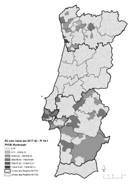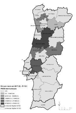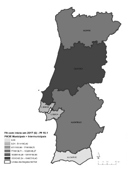 Em todos os mapas os intervalos foram definidos em função dos valores mínimos e máximos de cofinanciamento (ou seja, FA) de cada unidade de análise, privilegiando-se o destaque gráfico de padrões e não propriamente uma análise exaustiva e/ou comparativa de valores entre unidades. Por essa razão, os valores mínimos e máximos não são uniformes entre os vários mapas e frequentemente surgem como números decimais. Será importante referir que, não sendo disponibilizada para cada PO a data de aprovação das operações, a análise contemplou apenas o ano de início das operações (nas figuras 5 a 9, 11 a 15 e 17 a 20). Os montantes apresentados correspondem aos volumes totais das operações consideradas, iniciadas em cada ano, não se representando a distribuição do FA pelo período de execução de cada operação. Exemplificando, se à operação X tiver sido atribuído um cofinanciamento de 10 000€ e esta decorrer entre 2017 e 2018, não se apresenta a distribuição do FA pelos dois anos; a operação e o valor serão inteiramente considerados no mapa do ano de 2017, o ano de início.