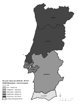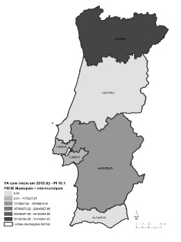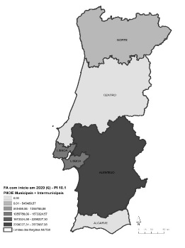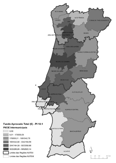 A dimensão intermunicipal é central na execução dos PIICIE, exceto na Área Metropolitana de Lisboa (AML) e na Comunidade Intermunicipal do Alentejo Litoral (CIMAL), Assim, entre 2016 e 2020 foram aprovadas 45 operações intermunicipais (Quadro 7), sendo que na região Norte várias CIM foram entidades beneficiárias de mais do que uma operação PIICIE. Destacam-se a CIM do Ave e a CIM do Tâmega e Sousa, cada uma com 9 operações PIICIE. No Centro, a Região de Coimbra, ainda que possua apenas uma operação PIICIE cofinanciada, destaca-se pelo volume de fundo total aprovado (6 293 919,35€), aproximando-se, assim, do volume total de fundo aprovado das operações do Tâmega e Sousa (6 692 920,14€), tal como se representa na Figura 9. Assim, as NUTS III com um maior número de operações aprovadas não representam, necessariamente, aquelas com um maior financiamento.
