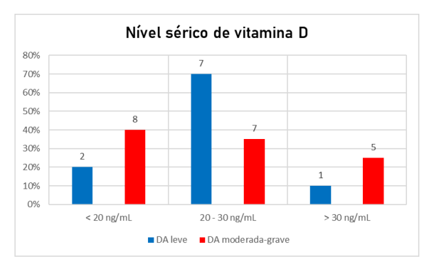 No grupo de pacientes com DA moderada a grave, a média de idade foi de 38 anos. 50% eram do género feminino. O valor médio de 25 OH vitamina D foi de 23,81 ng/mL e o desvio padrão, 1,52. Oito pacientes (40%) apresentaram nível sérico de 25 OH vitamina D abaixo de 20 ng/mL (Fig. 1).