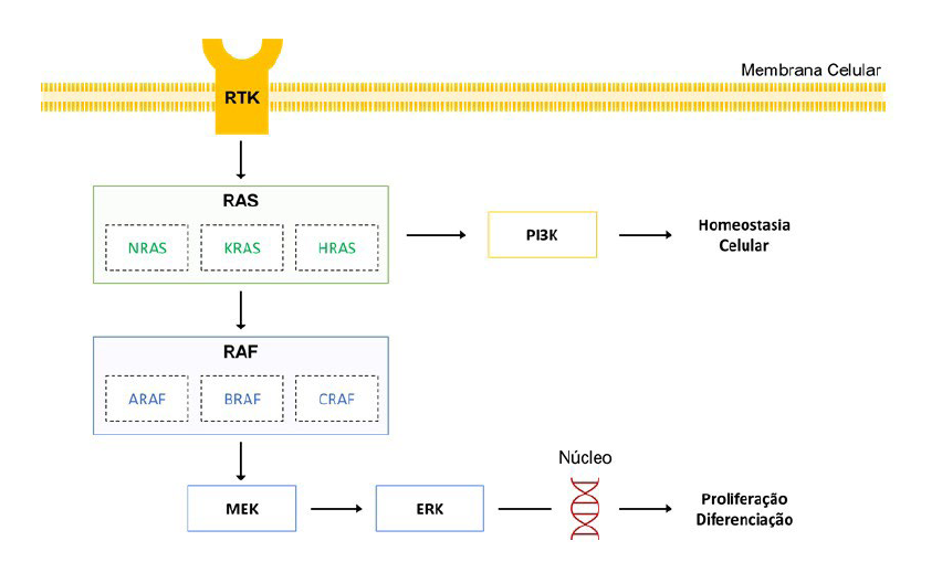 A via MAPK (Fig. 1) é uma via de sinalização intracelular essencial para o crescimento e proliferação celular. Em células normais, os estímulos externos, como fatores de crescimento, ligam-se ao recetor tirosina quinase (RTK), que leva à ativação de proteínas da família do sarcoma de rato (RAS): NRAS, KRAS, HRAS, podendo estas sinalizar duas vias diferentes: MAPK e PI3K, sendo esta última a segunda via mais frequentemente ativada no melanoma e a responsável pela homeostase celular. A via MAPK é ativada quando RAS dimeriza as proteínas quinases serina-treonina da família do fibrossarcoma acelerado (RAF), como ARAF, BRAF, CRAF, iniciando-se, assim, uma cascata de sinalização em que há fosforilação da quinase da proteína quinase ativada por mitogénos (MEK) que, por sua vez, atuam nas quinases reguladas por sinal extracelular (ERK). ERK é responsável pela transdução do sinal até ao núcleo contribuindo, desta forma, para a expressão de genes importantes para a proliferação, diferenciação e sobrevivência celular.2,5-9