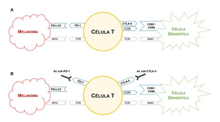 Figura 2 Regulação da resposta das células T. (A) Inibição da resposta das células T. (B) Anticorpos anti-PD-1 e anti-CTLA-4 ativam a resposta das células T. Adaptado de Davis LE, et al. Current state of melanoma diagnosis and treatment. Cancer Biol Ther. 2019;20:1366-79.20