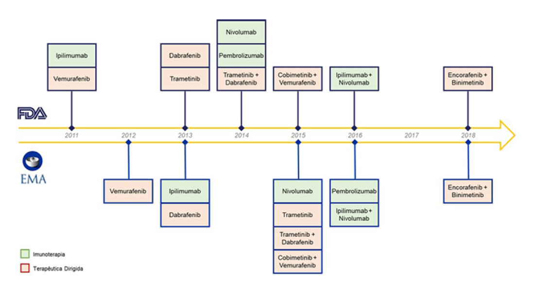Ao longo dos últimos anos, tem-se verificado uma alteração no paradigma do tratamento do melanoma metastático. Desde a aprovação do ipilimumab, em 2011, até à atualidade (Fig. 3), o prognóstico destes doentes mudou drasticamente.