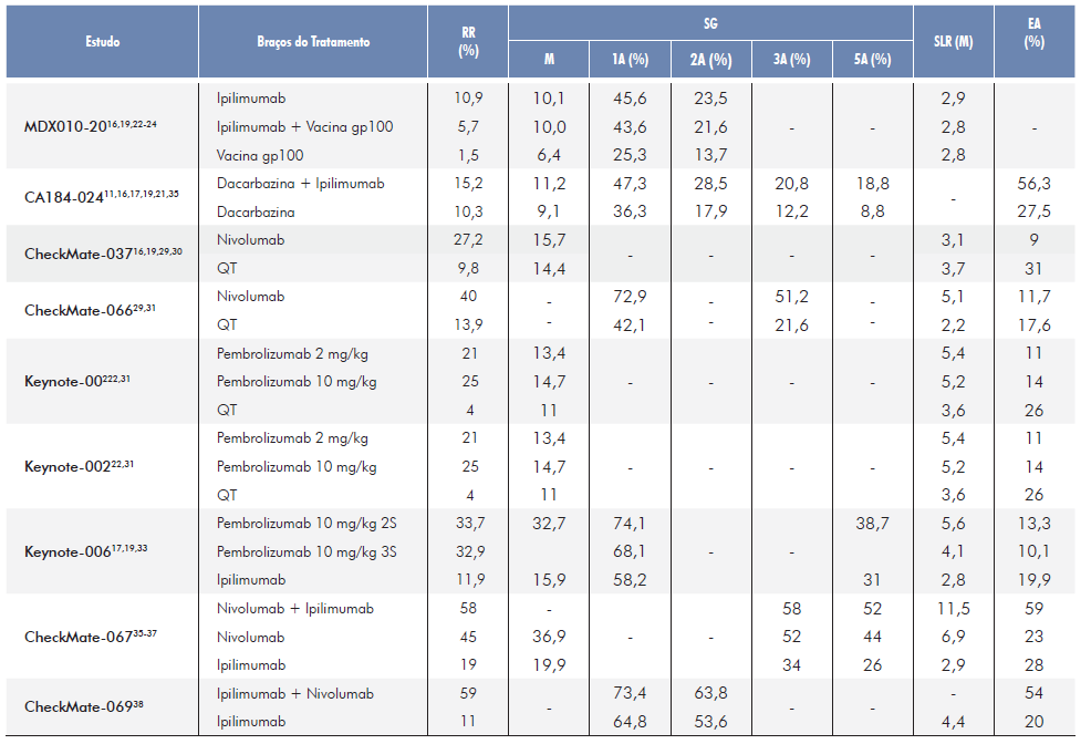 A: ano(s); M: média; RR: response rate; SG: sobrevivência global; SLR: sobrevivência livre de recorrência; EA: efeitos adversos