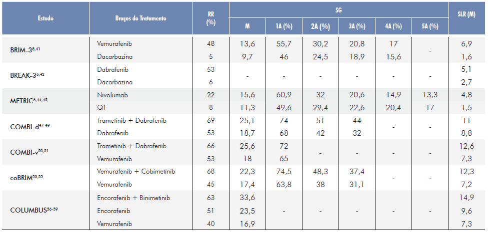 No entanto, a seleção dos doentes que são candidatos é de extrema importância. Por exemplo, os que apresentam doença oligometastática têm uma melhor SG com a cirurgia, assim como aqueles que têm um estadiamento M1a, contrariamente ao M1c. Assim, uma das hipóteses é, então, iniciar o tratamento com terapêutica dirigida com inibidores BRAF, com o objetivo de induzir uma resposta rápida e converter para uma doença oligometastática, sendo posteriormente indicada a cirurgia, seguida de tratamento com imunoterapia para aumentar a resposta imunológica.65 Serão necessários mais estudos que combinem a terapia sistémica com outros tratamentos, para se conseguir fazer propostas de tratamento baseadas na evidência.