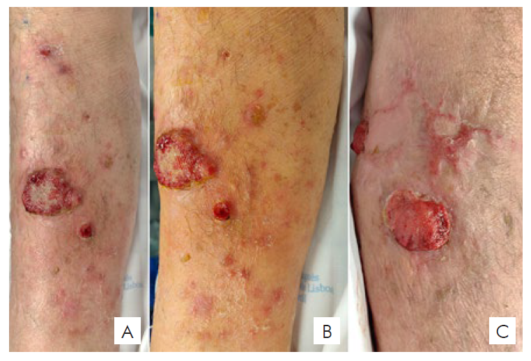 Figura 1 Multiple erythematous and violaceous papulonodules covered with haemorrhagic crusts, located on the anterior (A, B), lateral and posterior (C) aspect of the right lower leg.