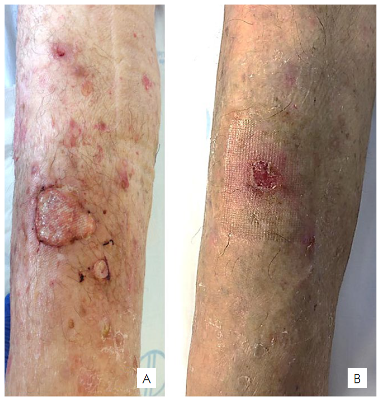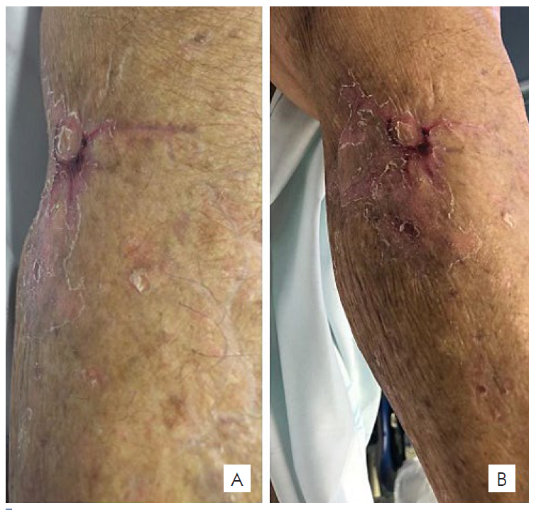 Figura 2 One week post-procedure - reduction in size and erythema of the cutaneous lesions (A); Four weeks post-procedure - 1x1 cm erosion on the anterior aspect of the right lower leg with complete resolution of the remaining lesions (B).