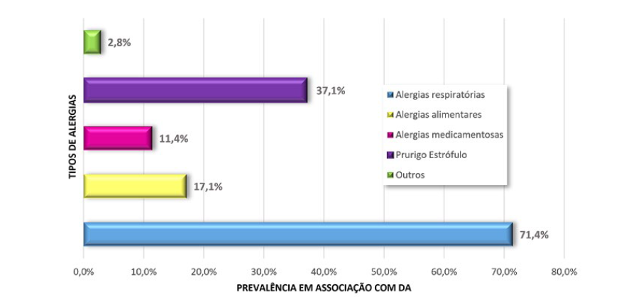 Concordando com Belda et al, o estudo evidenciou a rinite alérgica como a alergia mais prevalente nos portadores de DA.10 Quanto à prevalência de asma/bronquite e DA, os dados do presente estudo também mostraram-se concordes com a literatura.10,11