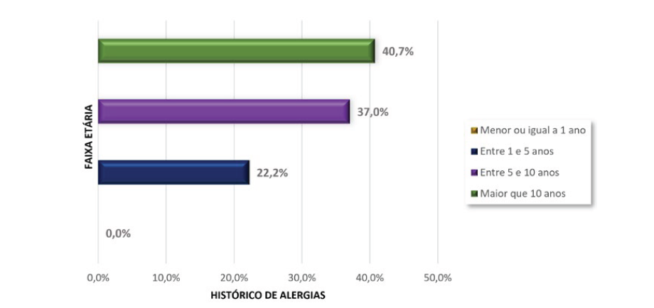 Analisando o histórico pessoal de alergia quanto à faixa etária, 11 pacientes (40,7%) tinham 10 anos ou mais; 10 pacientes (37,0%) tinham entre 5 e 10 anos e 6 pacientes (22,2%) tinham entre 1 e 5 anos. Nenhum paciente abaixo de 1 ano foi diagnosticado com outra alergia além da DA (Fig. 3). Dos 35 pacientes com DA, 22 (62,9%) apresentavam histórico familiar de alergias.