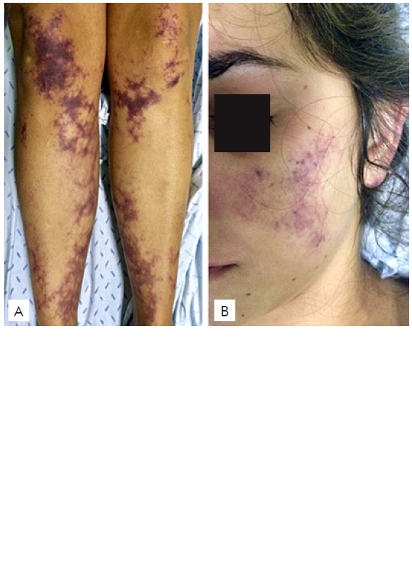 Figure 1 Initial clinical findings. (A), Reticulated violaceus patches located at the lower limbs. (B), Violaceus lesions of the face, at the malar region.