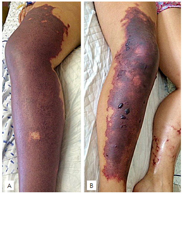 A previously healthy 20-year-old female presented with retiform purpuric lesions located in the upper and lower limbs, ears, and malar regions bilaterally (Fig. 1). These lesions were painful, had 24-hours of evolution and were rapidly progressive. Within hours, they became confluent, with formation of large necrotic violaceous plaques, that occupied almost the entire right lower limb (Fig. 2). At admittance, the patient had no fever and no accompanying symptoms. She was hemodynamically stable and otherwise well.