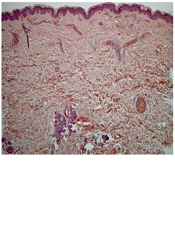 Figure 3 Histological findings, revealing thrombotic occlusion of the dermal vessels, without associated inflammatory infiltrate.