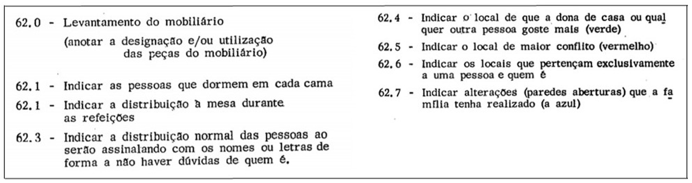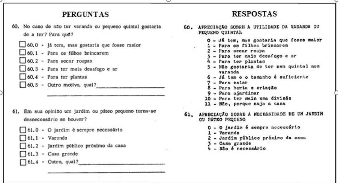 Numa primeira fase levaram-se a cabo estudos relacionados com a análise do comportamento dos utentes em determinadas áreas residenciais, particularmente com a realização do Inquérito-piloto sobre necessidades familiares em matéria de habitação (Portas e Gomes, 1963). Desenvolvido em linha com as metodologias aplicadas pelo sociólogo Chombart de Lauwe (Lauwe, 1959), pretendia este inquérito possibilitar o conhecimento das “modalidades de utilização da habitação em função de duas ordens de variáveis: famílias diferentes e diferentes conceções de organização do fogo e seu agrupamento” (Portas e Gomes, 1963, p. 14). Para além do registo em planta da localização do mobiliário e equipamentos domésticos (Figura 2), foi ainda dirigido à dona da casa um questionário minucioso onde constavam perguntas como: Há quantos anos vive nesta casa? Quantas pessoas vivem no alojamento? A família tem criada? Gostava que a sua casa tivesse mais quartos? Onde costuma tomar as principais refeições? Costuma ficar alguém na sala depois do jantar? A sua cozinha tem sol? Em que divisões da casa deixa as crianças pequenas brincar? Para que lhe serve a varanda? (Figura 3). O apuramento deste inquérito, cujos resultados foram publicados pelo LNEC (Portas e Pereira, 1967) e também difundidos nacional e internacionalmente (d’Almeida et al, 2020), possibilitou igualmente uma caracterização demográfica e sociocultural das famílias inquiridas, elaborada pelo sociólogo João Ferreira de Almeida (n. 1941) (Portas e Gomes, 1963). Consequente, seguiram-se dois novos inquéritos : i) o Inquérito à habitação urbana (Pereira e Portas, 1967; Pereira e Gago 1972 e 1977), que procurou refletir sobre a influência nas atividades da casa e zonas exteriores a esta mas diretamente relacionadas com a habitação; e ii) o Inquérito à utilização da cidade (Pereira, 1970a), com enfoque na relação da habitação com a vida urbana na cidade, oferecendo aos projetistas urbanos daquele tempo um maior conhecimento acerca da distribuição dos locais de permanência obrigatória (habitação e trabalho) e dos locais ‘atraentes’ para o uso (mistos de tempos livres). A análise e interpretação das atividades realizadas na habitação relacionadas às características socioeconómicas dos núcleos familiares foi apresentada em O uso do espaço na habitação (Pereira e Gago, 1974) e divulgada “através dos canais a que esta instituição normalmente recorre: publicação de relatórios, apresentação de comunicações em congressos, conferências e outros tipos de encontros técnicos, e realização de seminários integrados em ações de especialização” (Portas e Gonçalves, 1979, p. 71).