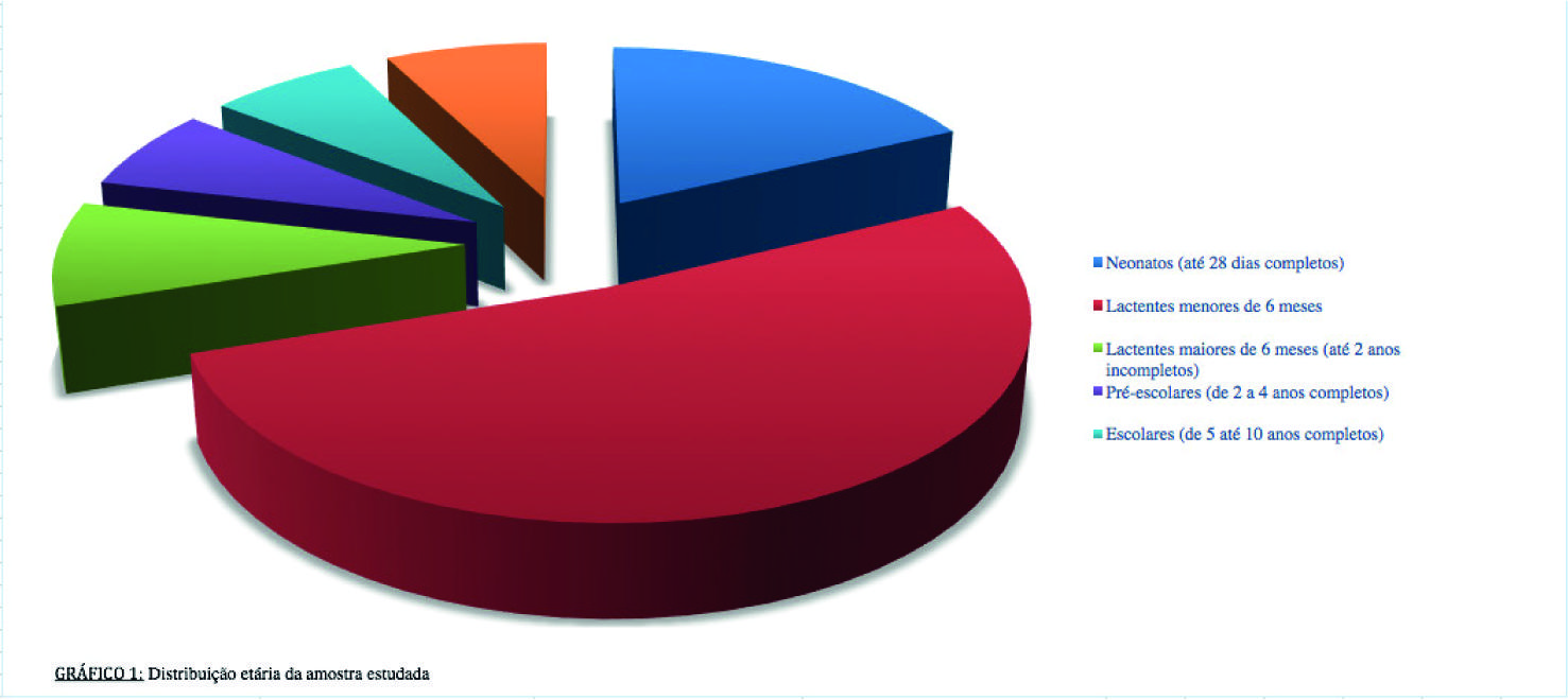 Das 173 crianças e adolescentes incluídos no estudo, 47,1% são meninos enquanto os outros 52,9% são meninas. As idades variam entre 9 dias e 19 anos, com média de 1 ano, 8 meses e 22 dias. Crianças classificadas como prematuras, de acordo com a classificação da Organização Mundial da Saúde, tiveram suas idades no dia da primeira consulta corrigidas. Pacientes em cujos prontuários não foi possível encontrar a data da primeira consulta não tiveram suas idades consideradas para estes cálculos, perfazendo um total de 1,1% dos dados coletados. Das primeiras consultas pediátricas no centro de referência, 17,9% ocorreram ainda no período neonatal, até 28 dias completos, enquanto que o restante se divide em 52% de lactentes entre 30 dias a 6 meses de vida, 8,7% de lactentes entre 6 meses e 2 anos, 6,9% de pré-escolares, até 4 anos completos, 6,9% de escolares, até 10 anos completos, e 7,5% de adolescentes, de 11 a 19 anos (Gráfico 1).