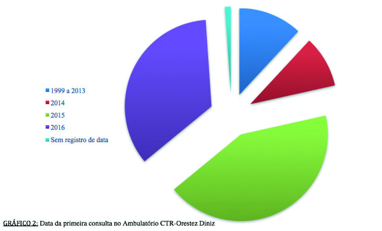 A grande maioria dos dados coletados foi proveniente de primeiras consultas ocorridas no ano de 2015, compondo 43,3% do total. O restante se divide entre os anos 2016 (33,5%), 2014 (9,8%) e de 2013 ao ano de 1999 (12,1%). Os demais registros (1,1%) se encontravam sem a data na qual as consultas ocorreram (Gráfico 2).