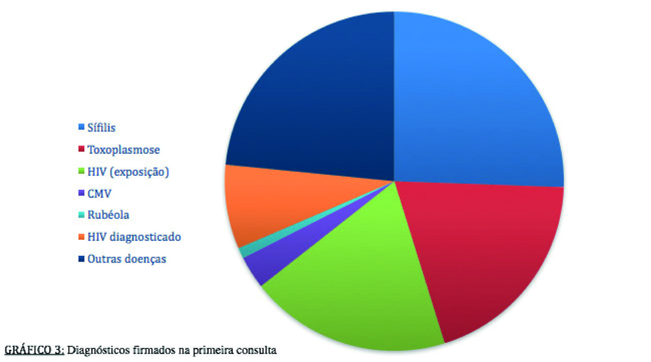 Dentre os principais diagnósticos firmados na primeira consulta das crianças em questão, temos as infecções congênitas suspeitas como os mais prevalentes, perfazendo um total de 129 (74,5%) prontuários. Ao analisarmos cada infecção individualmente, temos a sífilis congênita em primeiro lugar, com 48 (27,7%) registros, e a toxoplasmose congênita em segundo, com 37 (21,3%), seguidas pela exposição ao vírus da imunodeficiência humana (HIV) totalizando 36 pacientes (20,8%), pela citomegalovirose (CMV) congênita em 6 prontuários (3,4%) e pela rubéola congênita com 2 pacientes (1,1%). Quadros de infecção pelo HIV já firmados também possuem frequência elevada na amostra estudada, sendo o diagnóstico principal em 15 consultas (8,7%). Outras doenças, como leishmaniose visceral, meningoencefalite viral, linfadenomegalias, esquistossomose e imunodeficiência a esclarecer, se dividem entre os outros 44 prontuários analisados, compondo 25,4% da amostra (Gráfico 3).