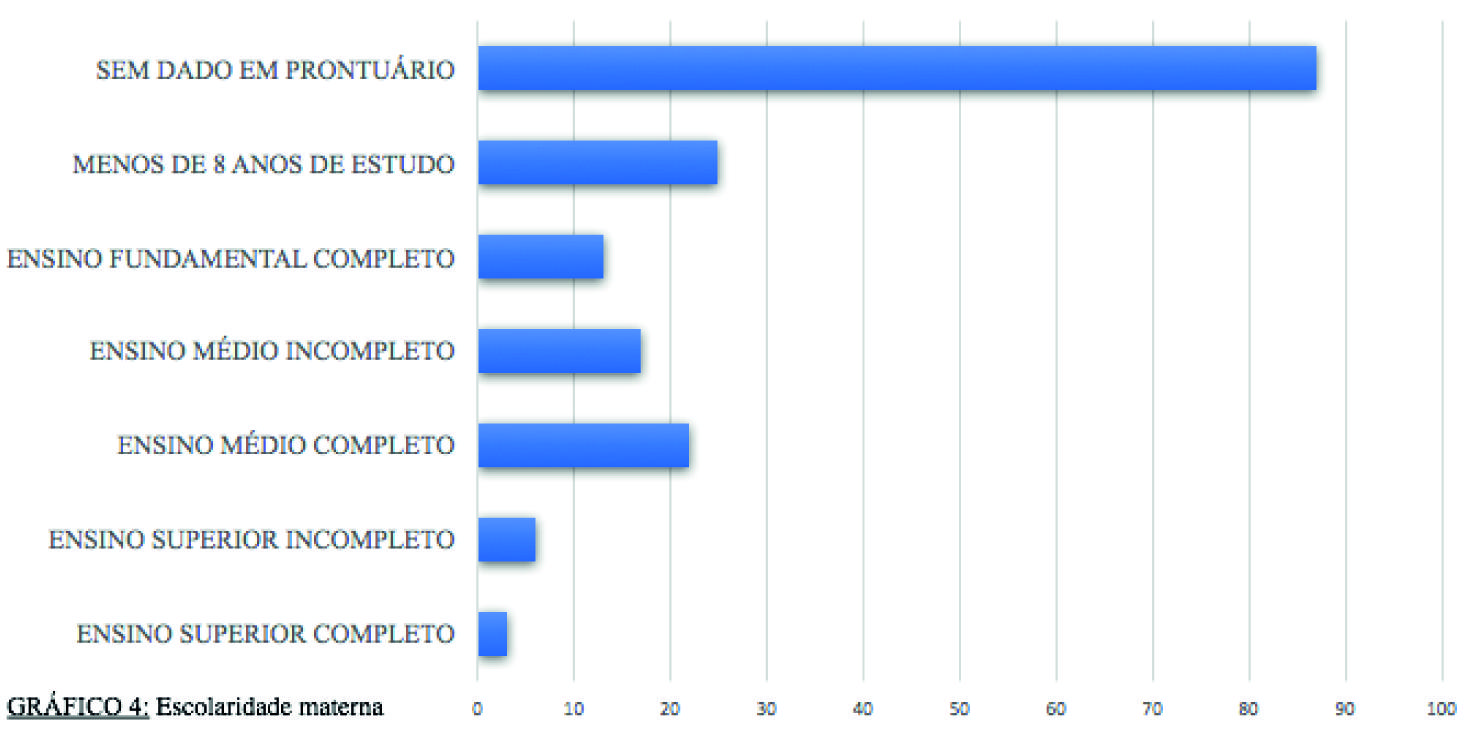 Outra limitação a ser considerada no estudo seria um viés de informação frente aos dados encontrados, uma vez que a falta de alguns dados, como escolaridade materna, foi fato recorrente durante a coleta. Os prontuários são ferramenta importante de consulta sobre informações do paciente, de sua história e de sua evolução clínica, bem como valioso instrumento de auxílio em possíveis questões jurídicas relacionadas ao atendimento prestado. O número elevado de registros de pacientes com dados faltantes nos revela a frequente inadequação no seu preenchimento. Dados como a escolaridade materna, idade do paciente no primeiro atendimento, sua procedência, a data da primeira consulta, entre outros, são de extrema relevância no acompanhamento longitudinal dos pacientes, que, por sua vez, é a proposta de assistência médica do CTR-UFMG. No entanto, quando esses dados não são encontrados nos prontuários, prejudica não só estudos como o nosso, mas também evidencia a resistência dos médicos assistentes em seguirem os protocolos que normatizam os registros de pacientes neste Hospital. Um dos fatores que consideramos importante para esse problema é a ausência de prontuários eletrônicos neste ambulatório, o que torna a pesquisa por dados, além do próprio registro destes, mais lento e complexo. Esse fator aliado ao grande número de atendimentos realizados por cada médico, diariamente, no centro de referência, pode influenciar de maneira negativa o modo como são confeccionados os prontuários, tornando-os menos eficientes e completos.