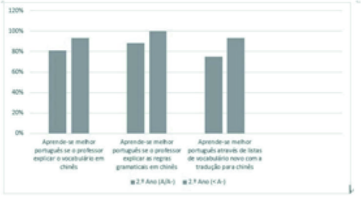 As afirmações do questionário centradas na importância da explicitação das regras gramaticais em chinês e na elaboração de listas bilingues de vocabulário para decorar (“Aprende-se melhor português se o professor explicar o vocabulário em chinês”; “Aprende-se melhor português se o professor explicar as regras gramaticais em chinês”; “Aprende-se melhor português através de listas de vocabulário novo com a tradução para chinês”) obtiveram um grau de concordância entre 93% e 100%. Os dados revelam que todos os respondentes valorizam significativamente o recurso à língua materna na aprendizagem do idioma-alvo. Relativamente à relevância de explicitar regras gramaticais na L1, a valorização é mais expressiva (100%) para o grupo de aprendentes com aproveitamento inferior a A - (Gráfico 1).