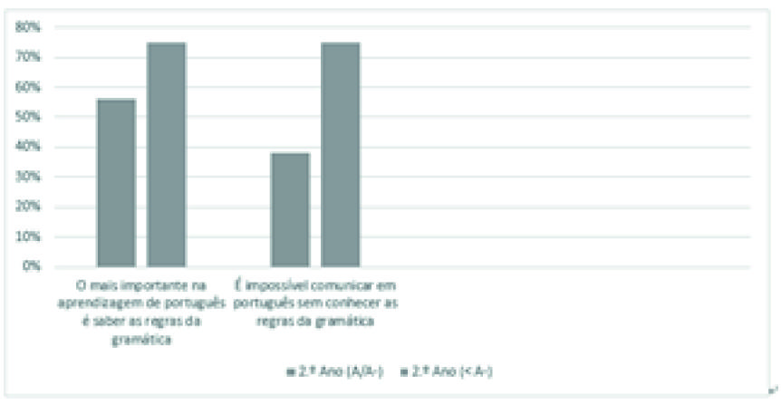 Os aprendentes com resultados inferiores a A/A- consideram, de forma significativa, que o conhecimento das regras gramaticais de uma língua estrangeira, como o português, é muito relevante. Para os que obtiveram melhores resultados, esse conhecimento também é importante mas não constitui o foco da aprendizagem.