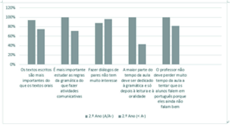 No Gráfico 3, o que os informantes declaram é que discordam significativa- mente da ideia de que os textos escritos são mais importantes do que os orais; discordam claramente da ideia de que é mais importante estudar regras de gramática do que realizar atividades comunicativas; discordam da ideia de que fazer diálogos de pares não tem interesse; discordam da noção de que a maior parte da aula deve ser dedicada à gramática; discordam da ideia de que o professor não deve perder tempo a tentar que os alunos falem em português porque eles não sabem falar.