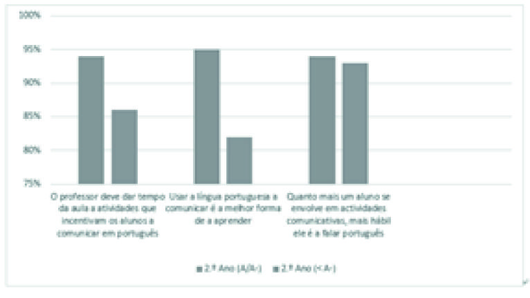 Todos os respondentes consideram necessárias as atividades comunicativas e reconhecem que se aprende a língua-alvo usando-a para (e a) comunicar. No entanto, os melhores alunos, talvez mais autónomos e mais confiantes no uso da língua, valorizam mais claramente este tipo de atividades.