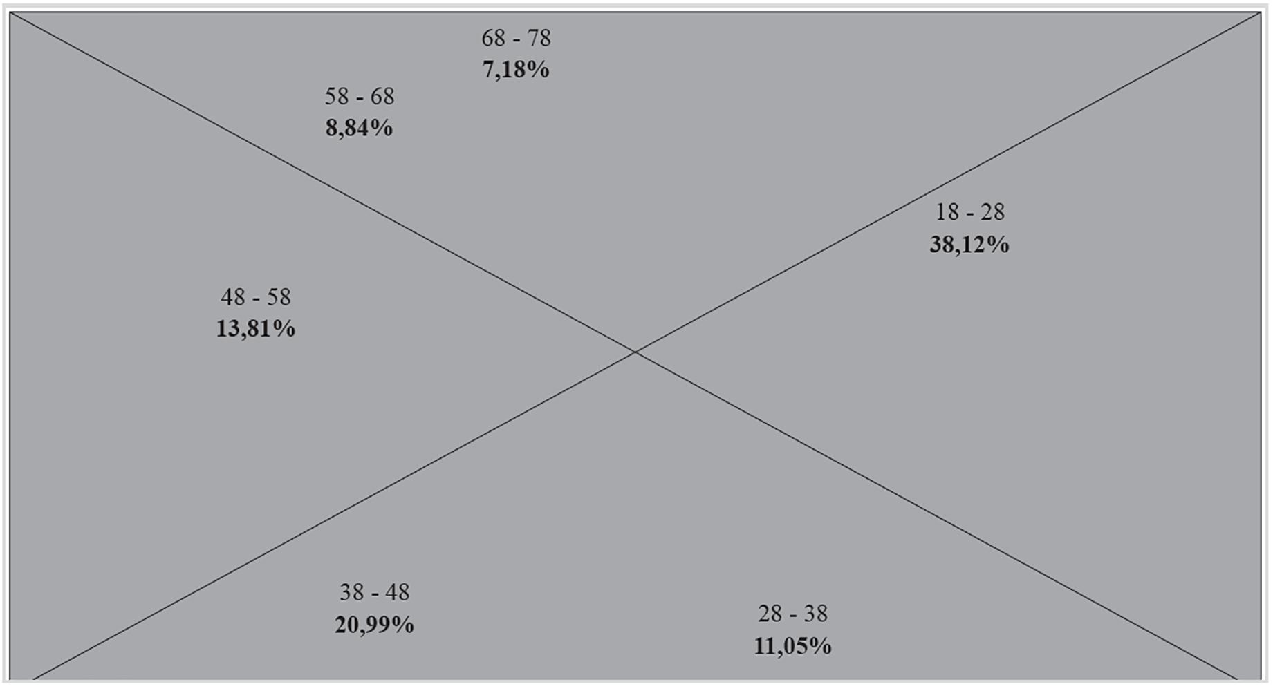A amostra foi composta por 181 indivíduos de um centro hospitalar, dos quais 123 (67,96%) são do sexo feminino e os restantes 58 (32,04 %) do sexo masculino. No que diz respeito à idade, os indivíduos foram divididos em seis faixas etárias distintas, conforme é possível observar na Figura 1. Verifica-se que 69 (38,12 %) dos inquiridos se encontram na faixa etária entre os 18 e 28 anos, seguido da faixa etária entre os 28 e 38 anos constituída por 20 (11,05%).